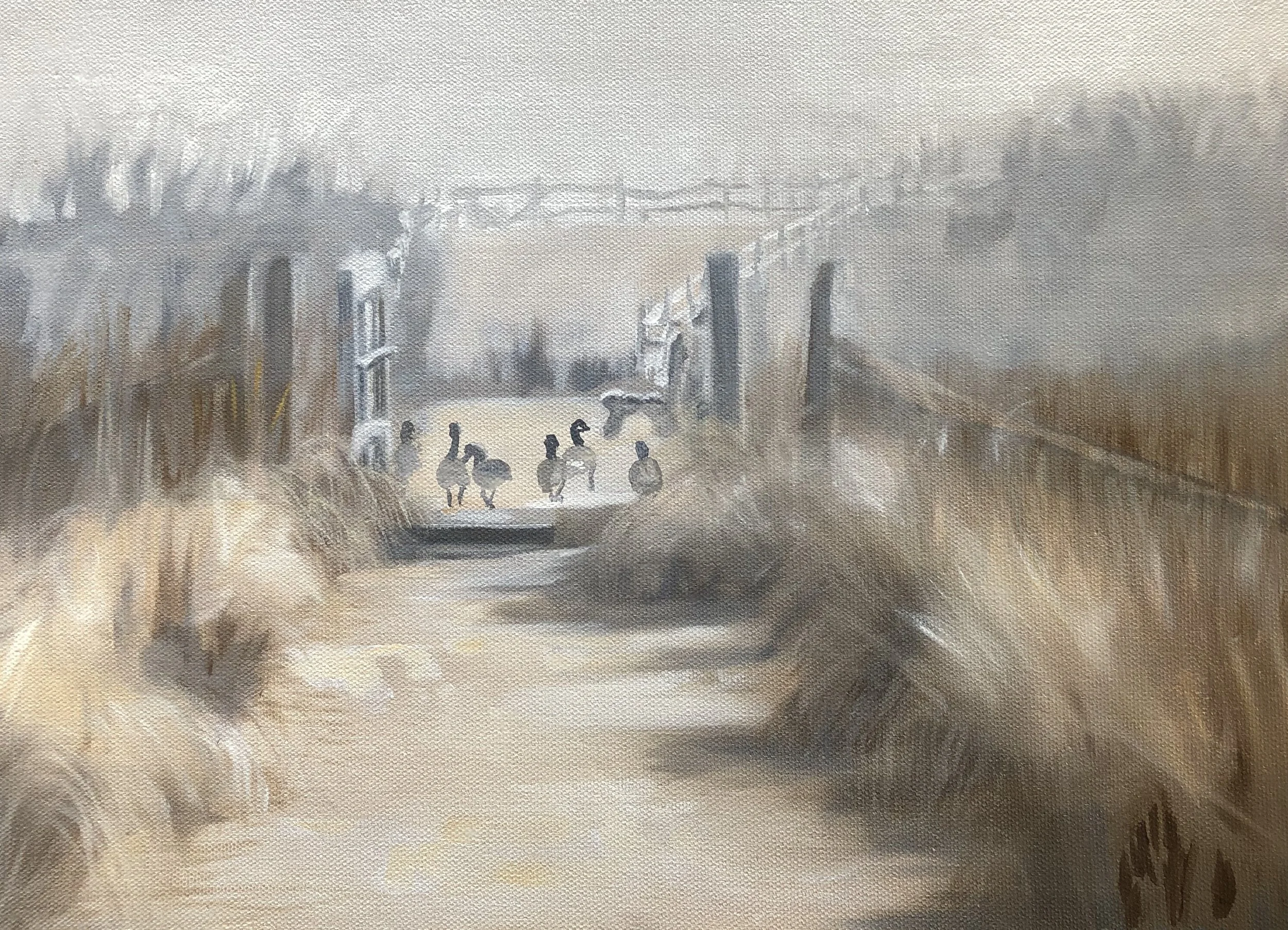 Geese waddle on the path, toward a bench in the distance.Oil on canvas, 12 X 16SOLD, Private Collection